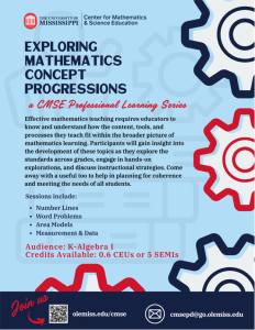 The Center for Mathematics and Science Education at the University of Mississippi has created a new resource for math teachers across Mississippi. The Mathematical Concept Progression Guide for the 2025 Mississippi College- and Career-Readiness Standards provides a quick reference for teachers looking to identify within and across grade connections between mathematics standards. Order your copy on the website or get a free copy of the guide when you register for and attend any session of the Exploring Mathematics Concept Progressions Professional Learning Series.