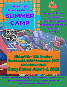 Mississippi School of the Arts is hosting an exciting Summer Arts Camp where creativity comes to life. Join the school for an immersive experience in dance, creative writing, filmmaking, theatre, visual arts, and vocal arts June 1-6. Residential cost is $495, and commuter cost is $295. Scholarships are available. Open to rising 8th through 10th graders statewide. Visit MSA Summer Arts Camp | Mississippi School of the Arts or email admissions@msabrookhaven.org for more information.