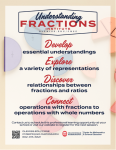 The Center for Mathematics and Science Education at the University of Mississippi is offering a two-day Understanding Fractions professional development institute for Grades 3-6 teachers. This institute will engage teachers in exploring strategies and tools to introduce representations of fractions, including manipulatives, number lines, and visual diagrams. Strategies for building conceptual understanding of fraction equivalence will be explored as well as strategies for teaching operations with fractions (addition, subtraction, multiplication, and division). Participants will discuss how these strategies build upon students’ prior experiences with operations with whole numbers.